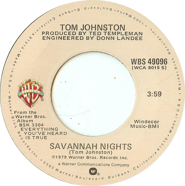 “Savannah Nights” is a single from Tom Johnston‘s first solo album album Everything You Have Heard Is True, released in 1979. The single reached #34 in the US Billboard Charts.